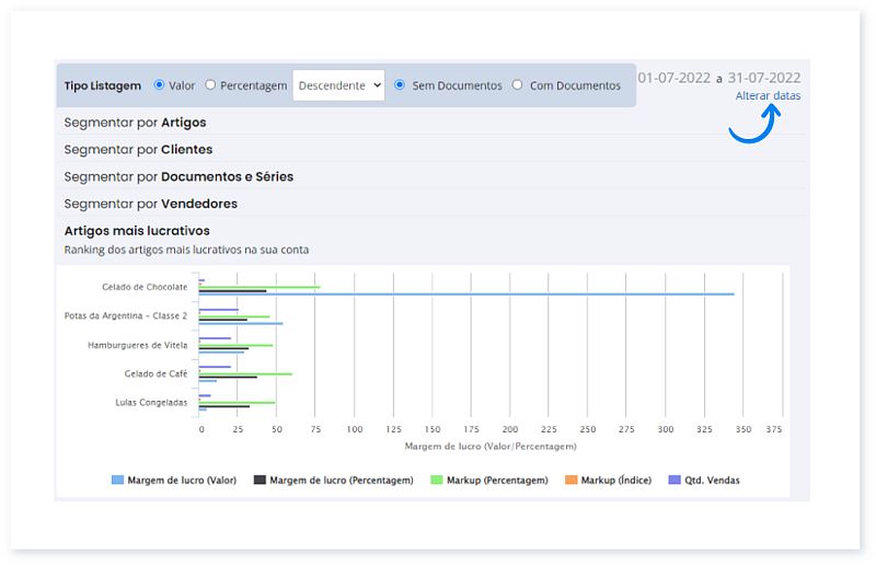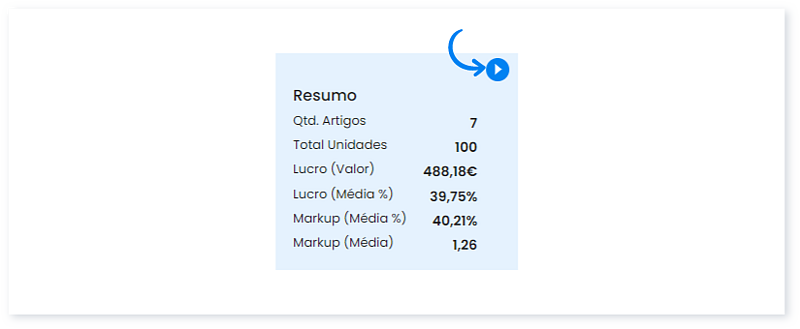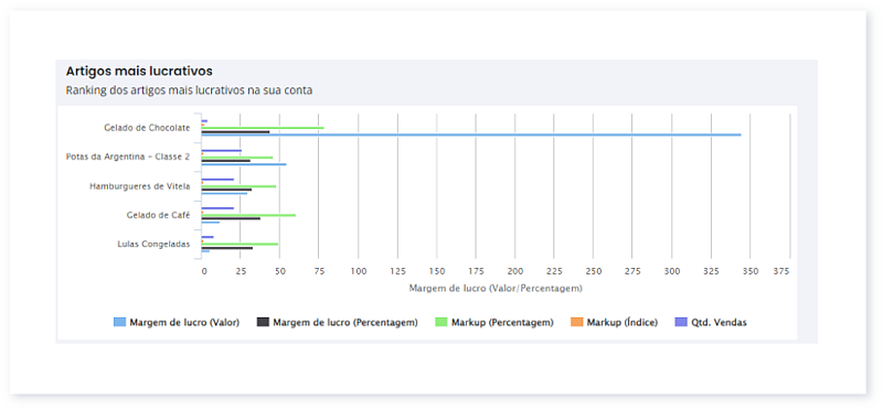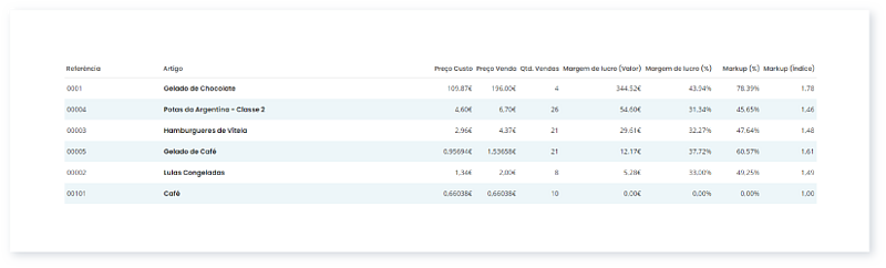 Para além do valor do lucro e da percentagem da margem de lucro, é apresentado o Markup, em índice e em percentagem. Para saber mais, consulte este Guia.