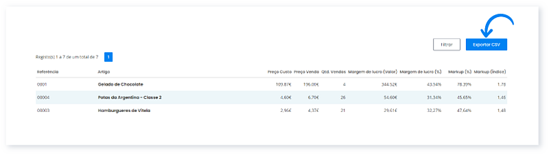 Aqui encontra a Margem de Lucro sob a forma de valor e percentagem, mas também o Markup sob a forma de percentagem e índice. Saiba mais através deste Guia.
