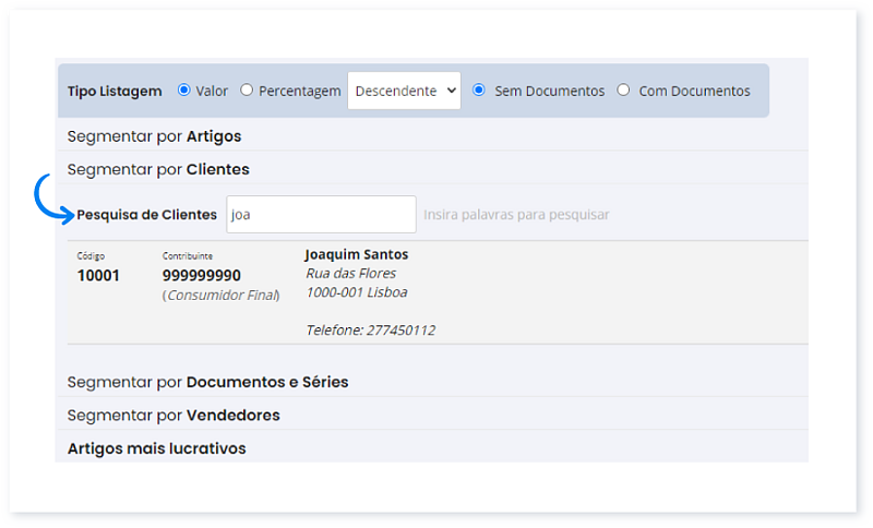 6. Em Segmentar por clientes, pode pesquisar os clientes para os quais deseja visualizar as margens de lucro, sendo-lhe depois apresentados todos os artigos faturados aos clientes que selecionou. Pode ainda segmentar a pesquisa por Vendedores e Documentos e Séries.